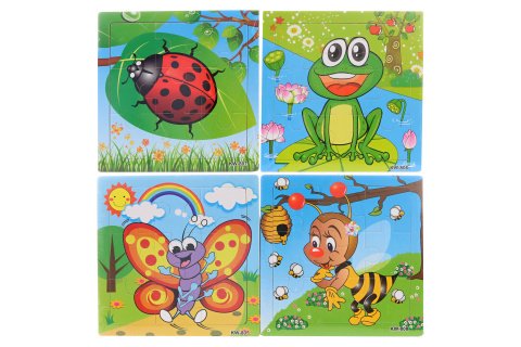 Drevené puzzle 9 dielikov s motívom zvieratiek. Rozmery 15x15 (s vkladacou doskou. 4 druhy - dodávame podľa skladovej dostupnosti. Vek 3+