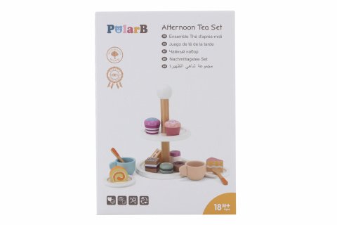Drevený čajový set. Sada obsahuje stojan, dva taniere, 2 šálky, dve lyžičky a 9 tort. Rozmery výrobku 18 x 25,7 cm. Rozmery balenia cca 27 x 18,5 x 18,5 cm. Vek 18m+