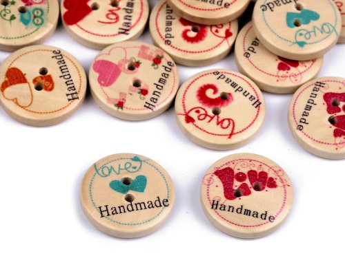 Drevené dekoračné gombíky s nápisom "Handmade" vyniknú na ručných výrobkoch, darčekoch a rôznych dekoráciách. Môžete ich použiť aj v scrapbookingu. Motív je jednostranný.