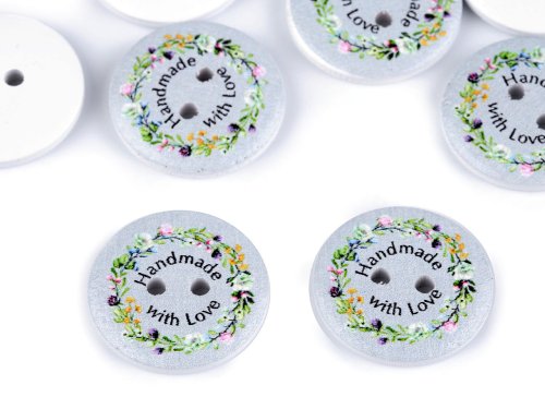Drevené dekoračné gombíky zdobia nápis "Made with love" [a "Handmade with love".] Vyniknú na ručných výrobkoch, darčekoch a rôznych dekoráciách. Môžete ich použiť aj v scrapbookingu. Motív je jednostranný.