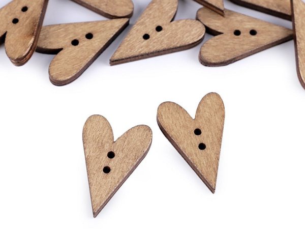 Drevené gombíky v tvare srdca využijete na dekoračné účely, prevažne pri scrapbookingu. Ozdobíte s nimi foto rámčeky, priania, menovky, pozvánky, denníky a pod. Môžete ich použiť aj do kvetinových väzieb, ktoré krásne oživia. Gombíky sú balené v sáčku. Neodporúčame ich prať. [V balení po 50 ks je 47 - 49 ks gombíkov.]