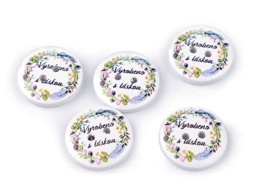 Drevené dekoračné gombíky zdobia kvetinová potlač a nápis "Vyrobené s láskou". Vyniknú na ručných výrobkoch, darčekoch a rôznych dekoráciách. Môžete ich použiť aj v scrapbookingu. Motív je jednostranný.