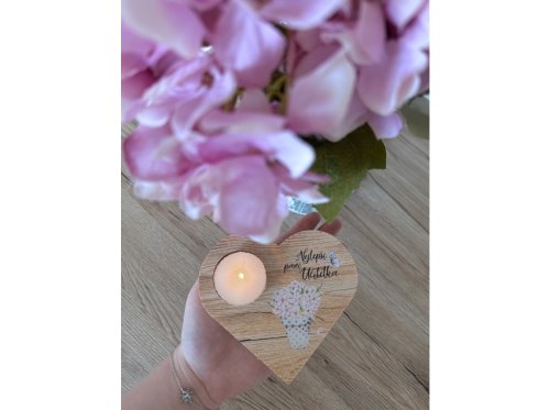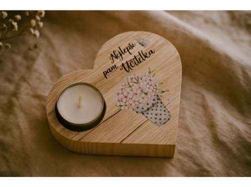 Štýlový a srdečný darček, ktorým potešíte každú pani učiteľku. Tento drevený svietnik v tvare srdca je navrhnutý pre čajovú sviečku a zdobený nápisom „Najlepšia pani učiteľka“. Spája v sebe prírodný materiál, jemný design a vďačné posolstvo.