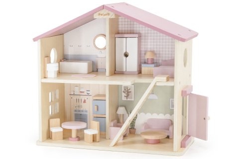 Drevený domček pre bábiky. Domček sa skladá z kuchyne, obývacej izby, kúpeľne a spálne. Súčasťou balenia je 16 drobných doplnkov. Rozmery domčeka 40,5x19,5x38 cm. Rozmery balenia 42x40x21 cm. Vek 3+