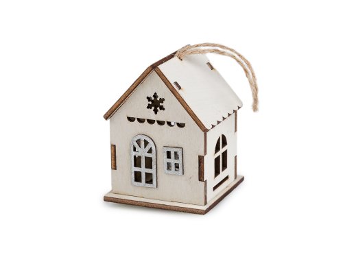 Drevený svietiaci domček má pútavo spracované výrezy. Teplé svetlo vytvára príjemnú atmosféru, ktorá zútulní každý interiér. Za jutové pútko ho môžete zavesiť na stromček, vence a pod.