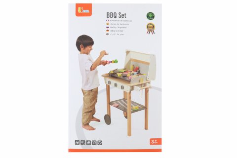 Drevený gril s doplnkami. Balenie obsahuje gril o veľkosti cca 88,4 x 67,8 x 38,6 cm, jedlo, náčinie ku grilu a ďalšie doplnky. Rozmery balenia cca 41 x 64,5 x 11 cm. Vek 3+