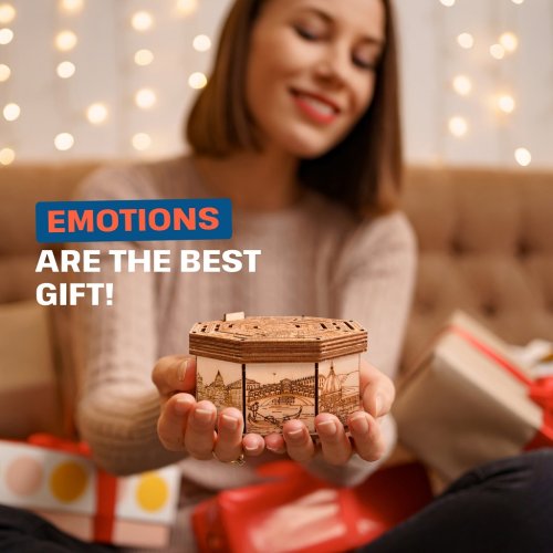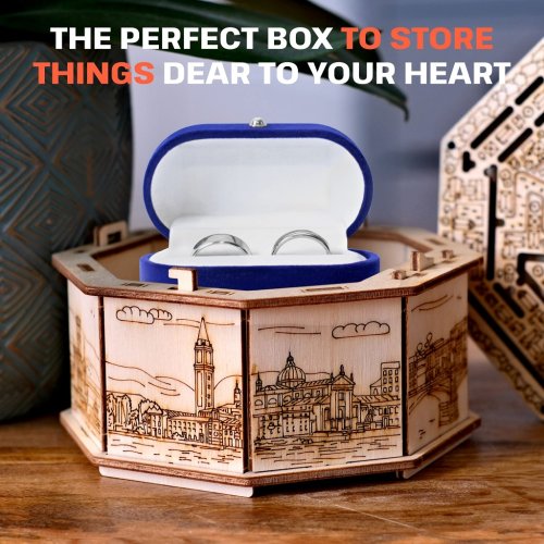Odhaľte mechanizmus magického bludiska, aby ste získali tajnú priehradku. Venujte darček s prekvapením, alebo skryte svoje tajomstvá vďaka tomuto vysoko kvalitnému boxu s jedinečným dizajnom. Secret Maze Box je dokonalý na uloženie vecí, ktoré sú vášmu srdcu drahé. Elegantný tvar ho premieňa na umelecké dielo, ktoré bude ozdobou každého interiéru. Vyrobený bol šetrne k životnému prostrediu, zo 100% prírodných materiálov a všetky jeho časti boli presne vyrezané najlepšou laserovou technológiou. Spĺňa všetky európske bezpečnostné normy. Rozmery vnútorného priestoru: 9,5 x 10 x 4,5 cm Vek: 14+ Materiál: brezové drevo