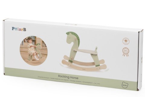 Drevený hojdací kôň v zelenkavej farbe. Rozmery 65x30x50,5 cm. Balené v krabici. Rozmery balenia 67x27x6 cm. Vek 12m+