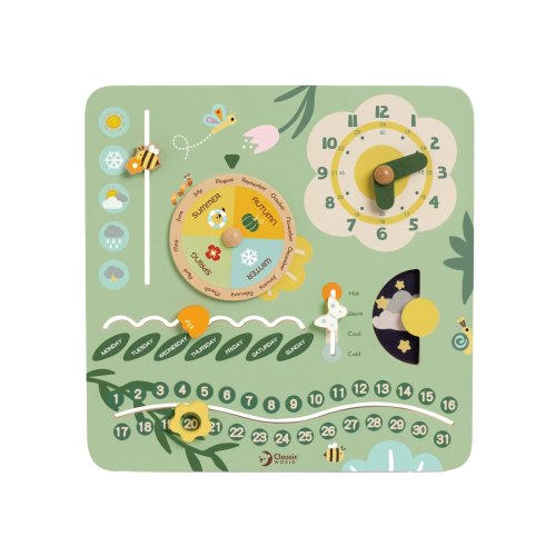 Štýlový drevený kalendár v anglickom jazyku je skvelým pomocníkom na výučbu času, ročných období, dní v týždni aj základných anglických slovíčok. Deti si môžu každý deň samy nastaviť dátum, mesiac, počasie alebo deň v týždni pomocou otočných a posuvných prvkov. Farebné prevedenie je prehľadné a zábavné, ideálne pre domáce učenie aj do škôlky. Hračka rozvíja slovnú zásobu, orientáciu v čase aj samostatnosť. Veľkosť balenia: 31 cm x 31 cm x 5cm. Vhodné pre deti od 3 rokov.