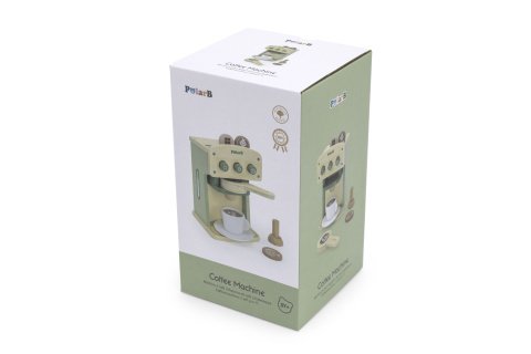 Drevený kávovar s príslušenstvom. Balenie obsahuje kávovar, páku, hrnček, podšálku a 4 kolieska s obrázkom druhu kávy. Rozmery kávovaru 12,5x12,5x19,5 cm. Rozmery balenia cca 13x13x23 cm. Vek 3+