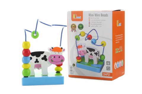 Drevený labyrint s kravičkou. Kravička má ohýbaciu hlavičku. Rozmery labyrintu cca 10 x 7 x 15 cm. Rozmery balenia cca 17 x 9 x 12 cm. Vek 2+