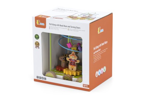 Drevený labyrint na kolieskach o rozmere cca 20,5 x 25 x 19,5 cm. Súčasťou labyrintu aj ozubené kolieska, ktoré sa pri pohybe točia. Súčasťou šnúrka na ťahanie. Rozmer balenia cca 24 x 25,5 x 19 cm. Vek 18 mes+
