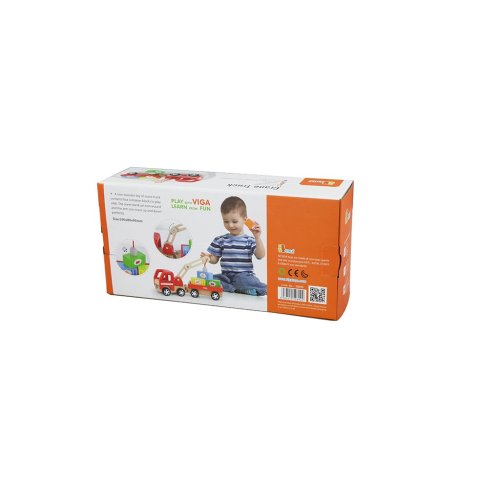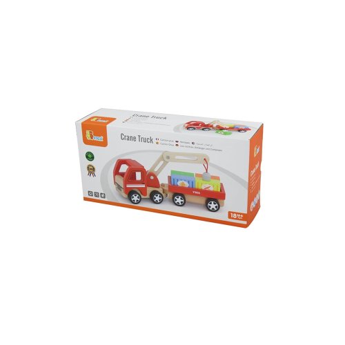 Súprava sa skladá z auta s otočným žeriavom a magnetom, odnímateľného prívesu a štyroch tematických nádob (ovocie, chlieb, zelenina, ryby) s magnetmi, ktoré umožnia vášmu batoľaťu nakladať a vykladať dopravné prostriedky. Celá sada je vyrobená z bukového dreva natretého nezávadnými farbami.