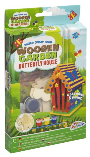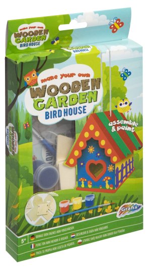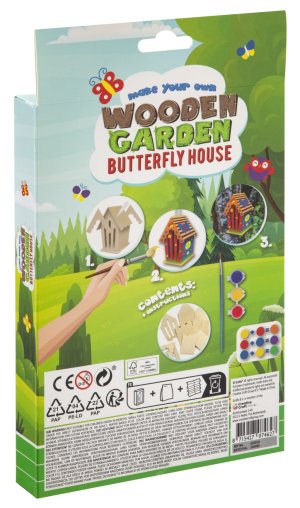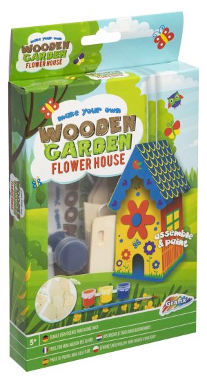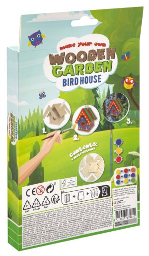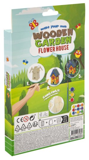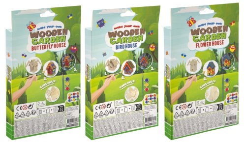 Drevený Mini domček – vytvoríš svoj drevený domček kvetinový/motýlí alebo vtáčí. Najskôr musíš domček postaviť a potom vyfarbiť priloženými farbami. Balenie obsahuje rozložený domček, tri farby a štetec.