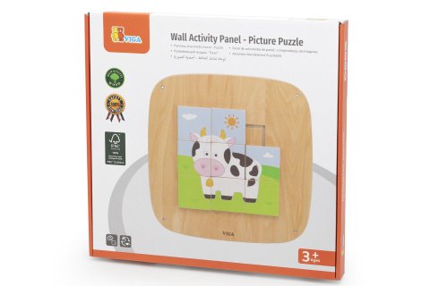 Drevený nástenný panel so skladačkou kravičky. Rozmery panelu 40x40x3 cm. Balené v krabici. Rozmery balenia 41x41x4 cm. Vek 3+