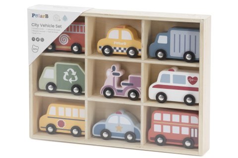 Drevená sada 9 dopravných prostriedkov. Balené v drevenej krabičke. Rozmery balenia 30x22,5x4,2 cm. Veľkosť dopravného prostriedku cca 9x5 cm – podľa druhu. Vek 24m+