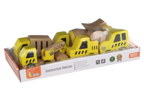 Drevený set stavebných áut. Súprava obsahuje celkom 6 kusov. Rozmery auta cca 7,5 x 2,5 x 5 cm (podľa druhu). Rozmery balenia cca 25,5 x 8 x 12,5 cm. Vek 18m+