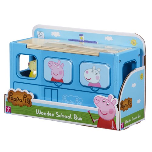 Drevený školský autobus Prasiatko Peppa - hrací školský autobus, v ktorom nájdeš drevený nábytok a 1 figúrku. Otvor autobus a zahraj si zábavné scénky, zo strechy autobusu môžeš pretláčať dolu drevené kocky podľa ich tvarov.