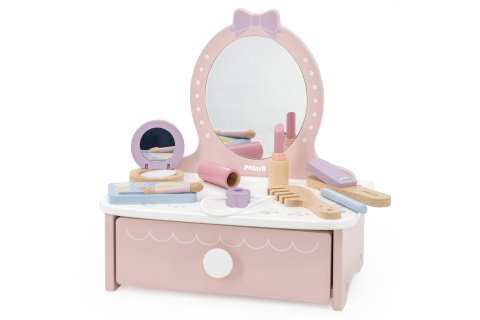 Drevená toaletka s rozmermi 26,5x28,3x18,5 cm. Balenie obsahuje stolček a drevené doplnky ako napr. hrebienok, kulmu alebo make-up. Balené v krabici. Rozmery balenia 28,5x24x12 cm. Vek 3+