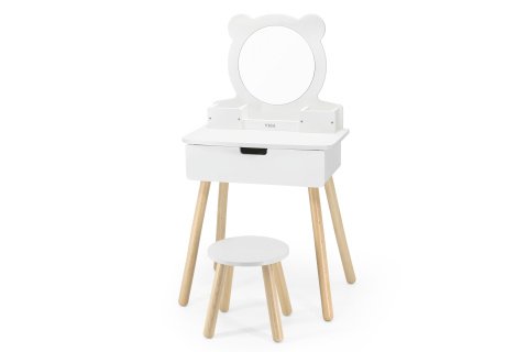 Tento drevený toaletný stolík so stoličkou je vybavený veľkým šuplíkom, ktorý poskytuje množstvo úložných priestorov. Stolík je ideálnym prostriedkom, kde sa deti môžu hrať so šperkami, vlasovými doplnkami a detským make- upom. Štýlov ý dizajn z neho robí ideálny doplnok do každej herne alebo detskej izby. Súčasťou balenia nie je príslušenstvo - je možné dokúpiť zvlášť (442032 alebo 505318). Rozmery balenia cca 37,5x50x16 cm. Rozmery stolíka 48x27,5x84. Rozmery stoličky 29,8x29,8x23 cm. Vek 3+
