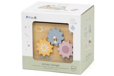 Všestranný trojuholník pre nekonečnú zábavu. Tento trojuholník má päť stabilných strán, ktoré je možné bezpečne umiestniť na akýkoľvek rovný povrch, a ponúka šesť pútavých aktivít: zrkadlo, rotujúce korálkový disk, posuvné koľajnice, otáčajúce sa ozubené kolesá, spájanie tvarov a počítadlo, ktoré slúžia aj ako praktická rukoväť. Rozmery balenia 18x18x15,5 cm. Rozmery hry 16,4 x17, 5x14, 6 cm. Vek 18m+