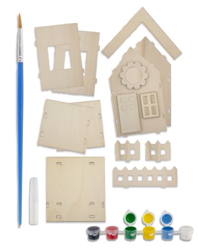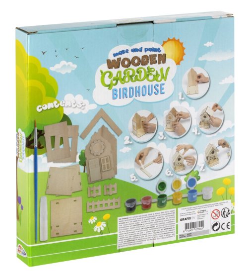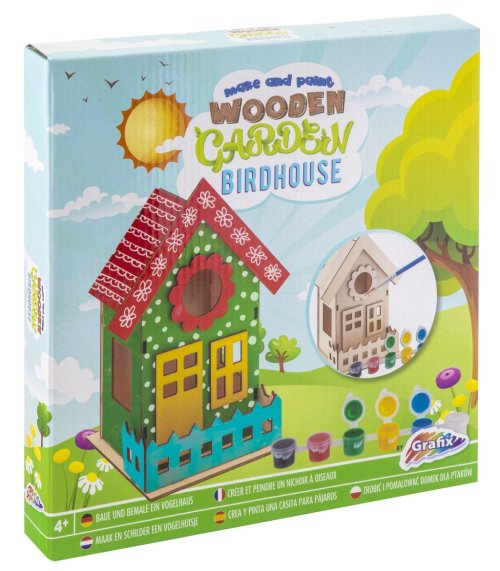 Drevený záhradný vtáčí domček 3D – zostav si svoj vlastný domček a vymaľuj ho priloženými farbami. Balenie obsahuje drevený domček, 6 farieb, lepidlo a štetec.