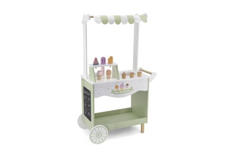 Veľká drevená pojazdná predajňa zmrzlín. Balenie obsahuje drevenú predajňu, drevené zmrzliny, drevené nanuky, drevené kornútky, drevené kliešte na naberanie zmrzliny, drevenú fľaštičku s toppingom a kresliacu tabuľu. Rozmery 63x30x104 cm. Rozmery balenia cca 66x32x10 cm. Vek 3+