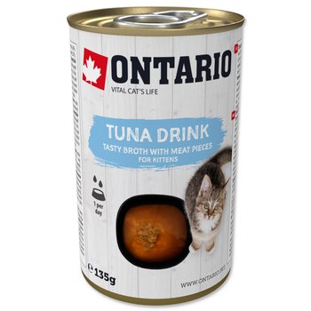 Doplnkové krmivo pre mačiatka – nápoj s kúskami kurčaťa a tuniaka.