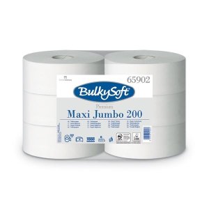 Toaletný papier jumbo so stredovým odvíjaním a vyberateľnou dutinkou Výška rolky 13,4 cm Priemer rolky 20 cm 2vrstvový Celulóza Návin 200 m Počet útržkov: 1052 Rozmer útržku: 19 x 13,4 cm V balení 6 roliek