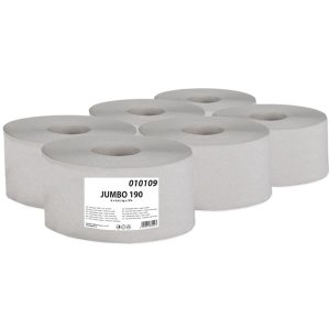 Jednovrstvový Jumbo toaletný papier vyrobený z recyklu Výška rolky 9,5 cm Priemer rolky 19 cm Návin rolky 120 m Bez perforácie Priemer dutinky 6 cm Balenie obsahuje 6 roliek
