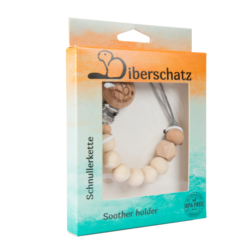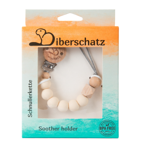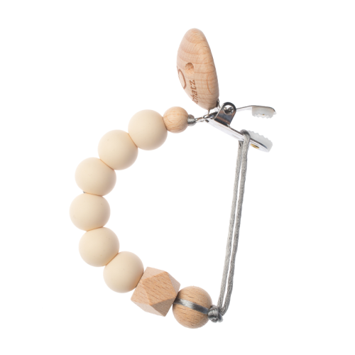 • vyrobený zo 100% hypoalergénneho silikónu, bukového dreva, saténovej šnúrky a kovového klipu