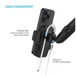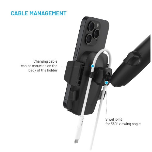 Aby váš mobilný telefón zostal bezpečne na mieste, je jeho stabilita zaistená skosenými opierkami na spodnej strane držiaka. Tie vám ani nebránia v prístupe ku konektoru. Mobil si nabijete aj na ceste do práce, za príbuznými alebo priateľmi. Pomocou 360 ° otočného kĺbu ramena si nastavíte ideálny pozorovací uhol. Odnímateľné úchyty na zadnej strane držiaka vám umožnia lepšiu organizáciu káblov.