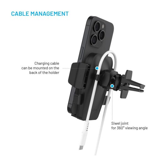 Aby váš mobilný telefón zostal bezpečne na mieste, je jeho stabilita zaistená skosenými opierkami na spodnej strane držiaka. Tie vám ani nebránia v prístupe ku konektoru. Mobil si nabijete aj na ceste do práce, za príbuznými alebo priateľmi. Pomocou 360 ° otočného kĺbu si nastavíte ideálny pozorovací uhol. Vždy teda dobre vidíte na obrazovku telefónu. Odnímateľné úchyty na zadnej strane držiaka vám umožnia lepšiu organizáciu káblov.