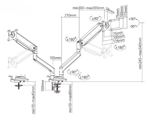 HLAVNÉ VLASTNOSTI: • Flexibilné nastavenie polohy: Držiak umožňuje ľahké nastavenie výšky, nastaviteľný náklon monitora v uhle +/- 90 °, vychýlenie do strán o 180 ° a otočenie monitora o 360 °, takže môžete ľahko nájsť optimálnu pozíciu pre pohodlné a ergonomické používanie. Odnímateľná doska VESA umožňuje jednoduchú inštaláciu monitora. • Vstavaný pružinový mechanizmus umožňujúci dokonalé nastavenie tuhosti ramien podľa hmotnosti monitora zaisťuje ľahký pohyb hore a dole. • Univerzálna kompatibilita: Tento stolný držiak je kompatibilný s väčšinou monitorov s veľkosťou od 17" do 35" palcov as VESA štandardmi 75x75mm a 100x100mm. Nezáleží na tom, či používate LCD, LED alebo OLED monitor, držiak monitora Brateck poskytne bezpečné a stabilné uchytenie. • Vstavaný systém priechodiek pre uľahčenie organizácie vedenia káblov. • Odolná konštrukcia: Držiak je vyrobený z vysoko kvalitného materiálu, ktorý zaisťuje stabilitu a odolnosť. • Jednoduchá inštalácia: Držiak je dodávaný s kompletným montážnym príslušenstvom, vďaka ktorému je možné ho ľahko namontovať na stôl v priebehu niekoľkých minút. Jednoduchá montáž pomocou svorky na dosky s hrúbkou 10-80 mm alebo pomocou priechodky na dosky s hrúbkou 10-40 mm.