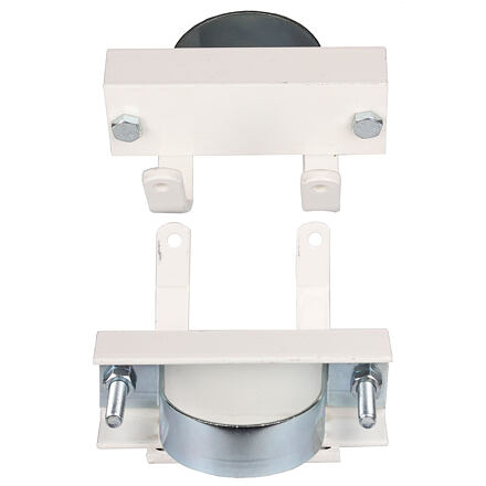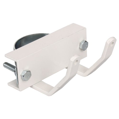 Dvojitý držiak na sieťovačky a metly konštruovaný pre montáž na stĺpik plotu s priemerom od 40 mm do 65 mm.
