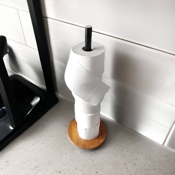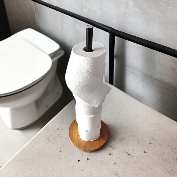 Dodajte svojej kúpeľni elegantný a moderný vzhľad s dizajnovým držiakom na toaletný papier v kombinácii čierneho kovu a prírodného dreva . Tento minimalistický a funkčný doplnok perfektne zapadne do moderných aj industriálnych interiérov. Robustná konštrukcia držiaka zaistí dlhú životnosť, zatiaľ čo kapacita až pre 6 roliek toaletného papiera vám ušetrí starosti s neustálym doplňovaním