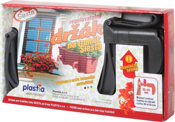 Plastový regulovateľný držiak na truhlík Siesta je vyrobený z extra tvrdeného materiálu. Možnosť zavesenia truhlíka na zábradlie.