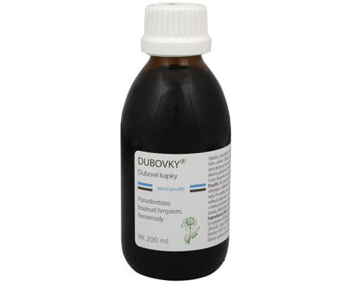 Dubovky - dubové kvapky sú určené na celkovú antimikrobiálnu starostlivosť o ústnu dutinu a pokožku. Obsahujú extrakty z bylín, ktoré majú sťahujúci účinok.