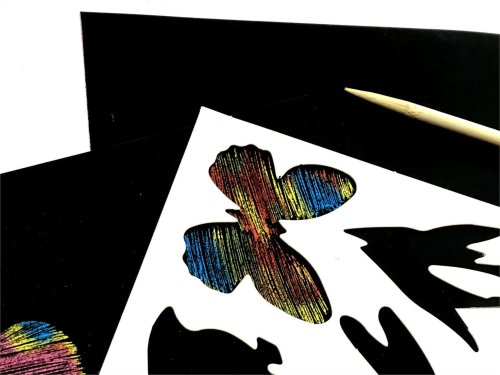 Sada obsahujúca dva škrabacie nepotlačené listy na voľné tvorenie, papierovú šablónku a drevený škrabací stylus. Škrabacie obrázky prebúdzajú kreativitu a nadšenie a nielen malých výtvarníkov zamestnajú na dlhé hodiny. Papier je potiahnutý čiernou vrstvou skrývajúcou podklad s dúhovým efektom. Obsah balenia: * 2 obrázky s farebnou vrstvou (rozmery 15,5 x 11,5 cm) * 1 hárok so šablónami * drevené škrabacie pero Variantu šablónok dodávame podľa skladových zásob.