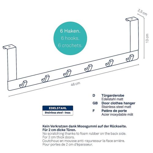 Dverný vešiak 6 háčikov Colgar nerez matná strieborná 46,0x13,0x2,5cm KL-22229