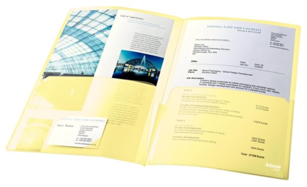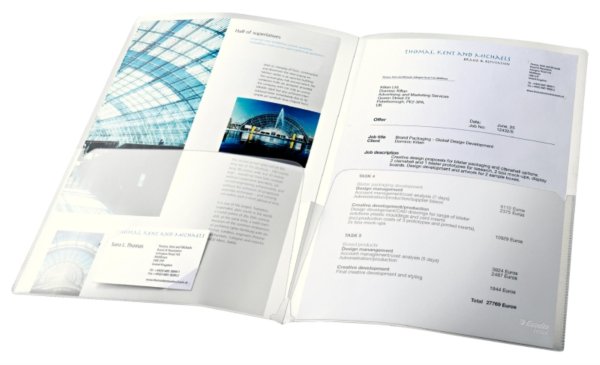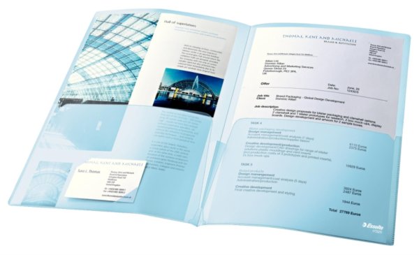Dvojité dosky pre profesionálnu prezentáciu dokumentov či projektov Vhodné pre formát A4 (na každej strane po jednom) prípadne je možné vložiť aj dokument formátu A3 (rozložené dosky); možnosť vložiť vizitku Kapacita …