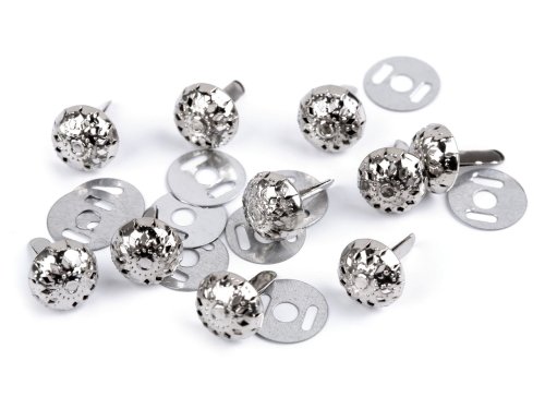 Dvojnožkové klince s ozdobnou filigránovou hlavičkou využijete ako ochranu dna kabelky, tašky alebo batohu, ale aj ako ozdobu (kabeliek, tašiek, opaskov a pod.). Klinec pripevníte jednoducho, stačí ho len vložiť do otvoru, cez nôžky navliecť pliešok a obe nôžky klinca roztvoriť do strán. Jedna sada obsahuje 1 klinec a 1 pliešok. Rozmery č. 1: - dĺžka klinca: 17 mm - priemer hlavičky: 10 mm - priemer pliešku: 13 mm