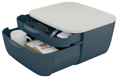 Zásuvkový box má veľkosť podstavy medzi formátom A4 a A5, smerom nahor sa rozširuje, plast je bez BPA a BPS, obal neobsahuje plasty