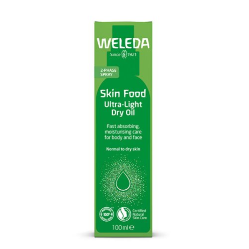 Dvojzložkový suchý olej v sebe spája ľahkosť hydratačnej hmly s výživou rastlinných olejov a extraktov z violky, organického nechtíka, rozmarínu a harmančeka. To všetko je doplnené o nezameniteľnú vôňu pomaranča, benzoe a levandule. Čo dokáže Ski Food Ultra-Light Dry Oil od Weledy:
