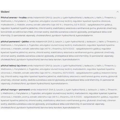 9 esenciálnych aminokyselín v instantnej forme, doplnené o vitamíny, zinok a extrakt zo zeleného čaju. Zmes je špeciálne navrhnutá na podporu optimálnej činnosti svalov, nervovej sústavy a zníženie vyčerpania pri tré ninku. Nevyhnutné aminokyseliny si naše telo nedokáže samo vytvoriť, a preto je dôležité ich prijímať zo stravy či doplnkov. Prirodzene ich nájdete napríklad v mäse, mliečnych výrobkoch alebo vajci. Elixírom života je už mnoho rokov nazývaný extrakt zo zeleného čaju. V ľudovom liečiteľstve je vyhľadávaný pre fyzické a psychické povzbudenie, či podporu koncentrácie. Zinok prispieva k normálnej funkcii imunitného systému, syntéze bielkovín a udržaniu normálnych kostí. Podporuje činnosť reprodukčného systému, s obľubou je vyhľadávaný na udržanie normálnych vlasov, nechtov a pokožky. Odporúčané dávkovanie: Rozmiešajte 12 g (cca 1/3 odmerky) v 350 ml vody a po minúte môžete konzumovať. Nápoj vypite maximálne raz denne pred tréningom. Neprekračujte odporúčané dávkovanie. Po namiešaní sú v nápoji zrejmé nerozpustené častice, čo je prirodzenou vlastnosťou výrobku. Upozornenie: Doplnok stravy, so sladidlami. Nenahrádza pestrú stravu. Nie je určené pre deti, tehotné a dojčiace ženy. Neužívať nalačno. Konzumácia s inými výrobkami obsahujúci zelený čaj by nemala presiahnuť 800 mg EGCG za deň. Ukladajte mimo dosahu detí. Chráňte pred teplom, mrazom a vlhkosťou. Dodávateľ: NUTREND DS ., as ., Chválkovice 604, 779 00 Olomouc, Česká republika