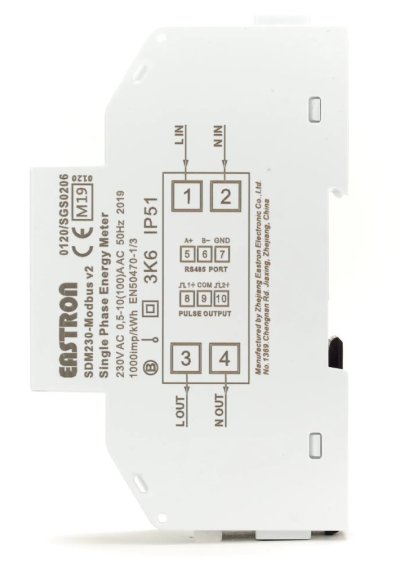 Moderný digitálny jednofázový multifunkčný elektromer , ktorý meria až 100 A priamej záťaže . SDM230modbus má 15 meraných parametrov a 4 rôzne režimy merania kWh, ktoré boli navrhnuté s ohľadom na rozvoj fotovoltaiky, ako je solárne a batériové úložisko.