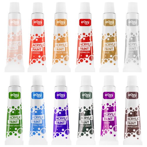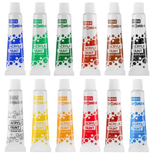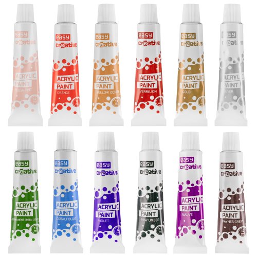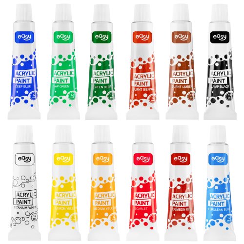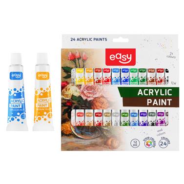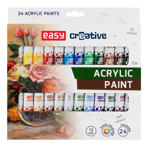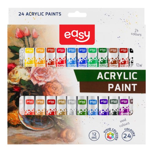 Akrylové farby zo série EASY Creative, to sú krycie farby v 24 intenzívnych bravách. Ich hustá konzistencia a vysoká kvalita farbív zaručujú veľmi dobré krytie maľovaných povrchov – najčastejšie papier alebo kartón.