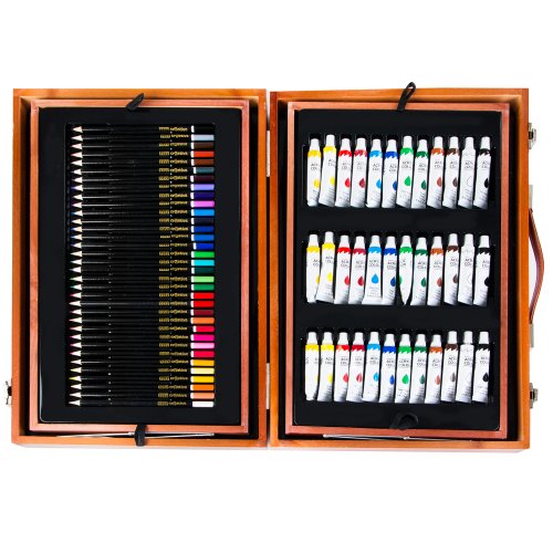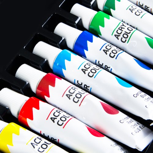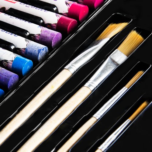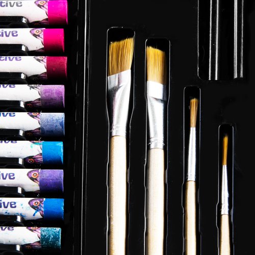 - Farebná paleta: 36 akrylových farieb v tube na maľovanie na plátno aj papier, 34 klasických pasteliek a 54 voskových pastelov v žiarivých farbách.