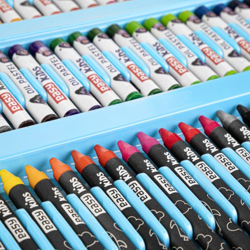 - Všetko pre maľovanie a kreslenie: 24 mini fixiek, 12 fixiek, 24 pasteliek, 24 voskových pastelov a 48 olejových pastelov v žiarivých farbách.