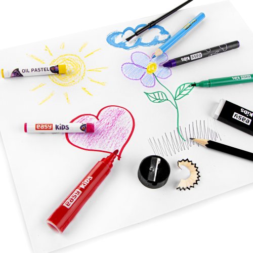 - Všetko pre maľovanie a kreslenie: 24 mini fixiek, 12 fixiek, 24 pasteliek, 24 voskových pastelov a 48 olejových pastelov v žiarivých farbách.